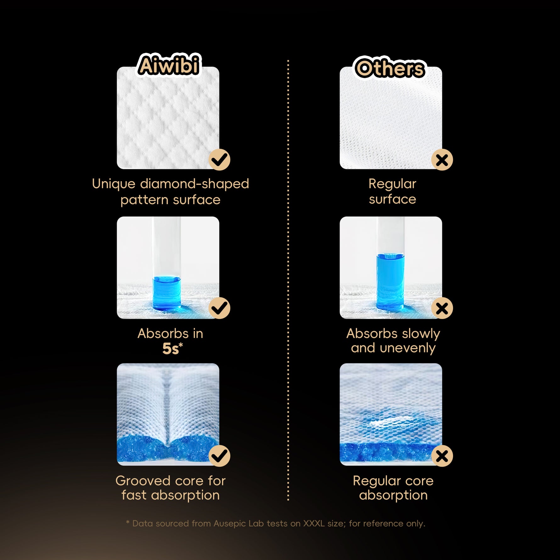 Ultrasonically bonded and glue-free for exceptional softness; the dual-layer top sheet instantly wicks moisture and channels liquid deep into the core for long-lasting dryness.