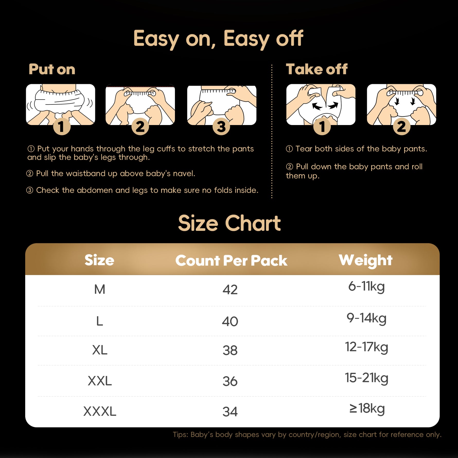 • The weight range on the diaper packaging is just a guide. If the diaper is too big, it can cause leaks. For example, the diaper may fit snugly around your baby's thighs, but if there's a gap in the crotch area, urine won't be absorbed quickly enough.