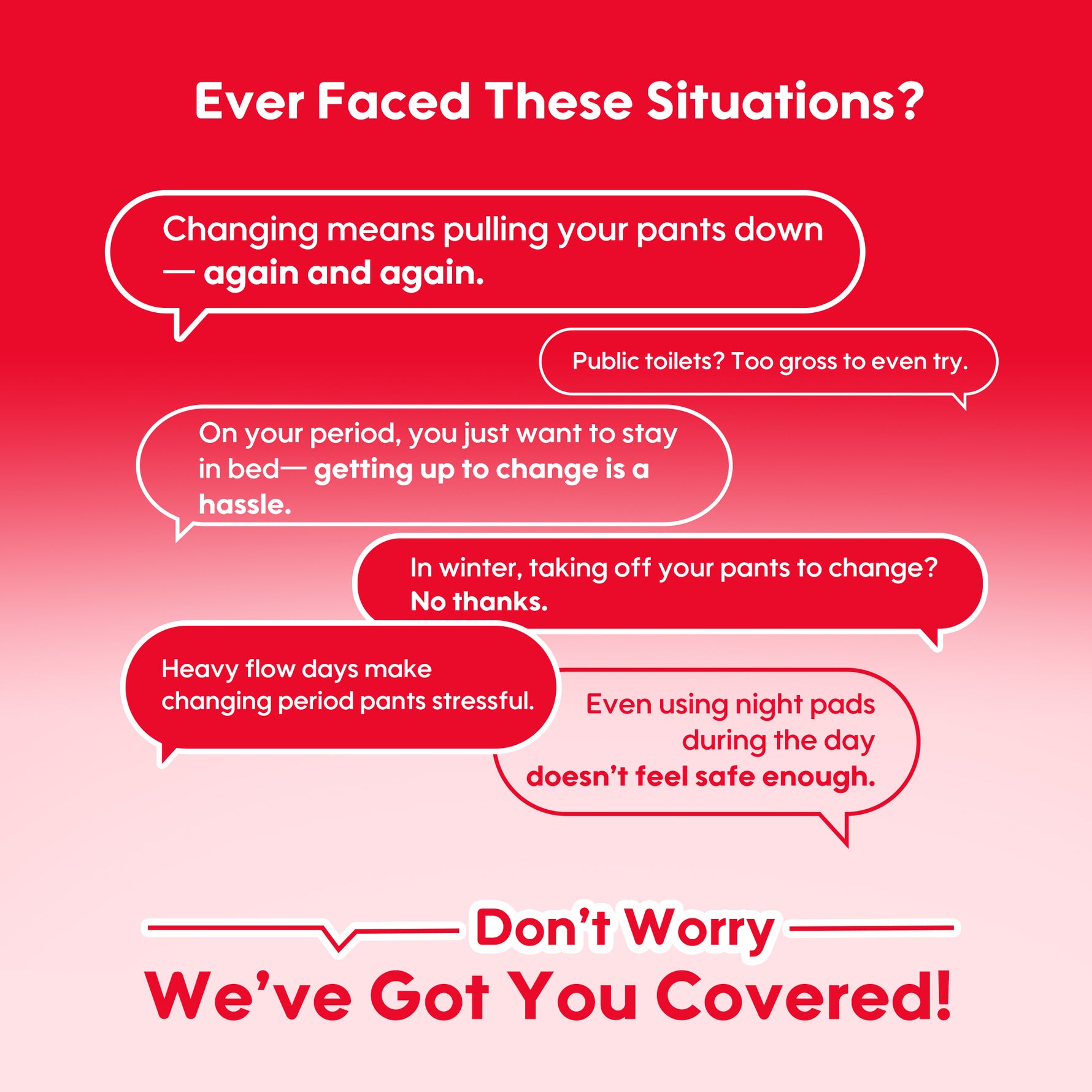 A common cause of leaks is a poor-fitting pad.Step up in size to help stop leaks. Find the right-size pad using your flow and your panty size and the chart above.